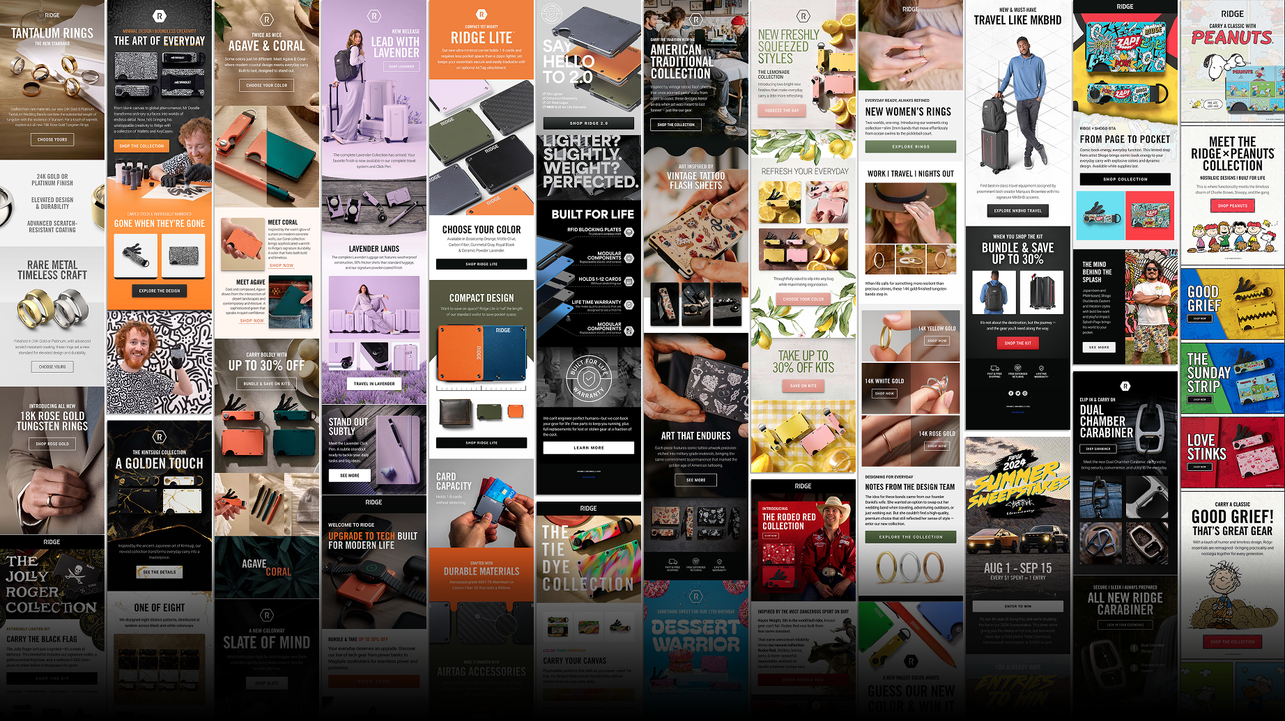 I’m proud of the work I did at Ridge building a Figma-native campaign production system embedding structured intake, modular assembly logic, graphic ID token implementation and review governance within a unified, cross department design and retention planning / scheduling environment. Designed 15-25 emails weekly, scaling to 100+ during peak BFCM periods without operational breakdown and contributed 3–5 additional cross-department campaign assets supporting launches and promotions.